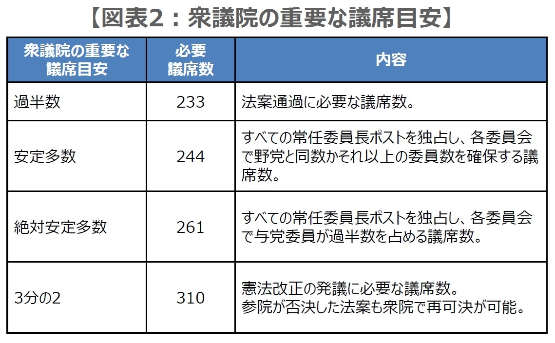 衆議院の主な会派と所属議員数をみると(図表1)、2025年11月28日に「改革の会」を組む無所属の国会議員3名が自民党の会派に合流したことで、自民党は199名となっており、日本維新の会の34名を合わせると与党は233名で、衆議院の過半数(233議席)に達しています。仮に解散総選挙となった場合、「安定多数(244議席)」、「絶対安定多数(261議席)」、「3分の2(310議席)」が議席数の目安になります(図表2)。