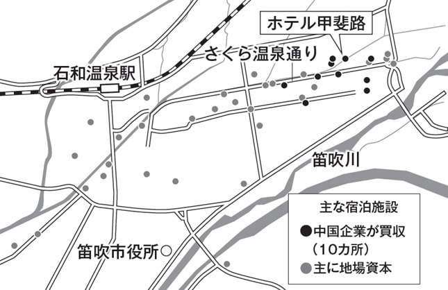 弱る温泉街。買いに出たのが中国資本だった。取材班が、石和温泉にある旅館やホテルなど40の主要施設を対象に調査を試みると、中国資本に買収された施設は、温泉街全体の25%を占め、既に10軒にも達していることが分かった。