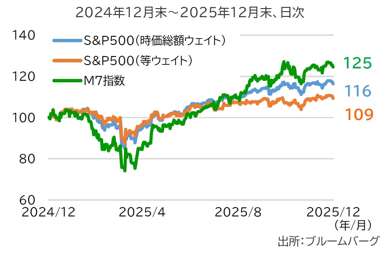 M7指数*1は25%上昇した一方、S&P500等ウェイト指数(M7以外の銘柄の動きを示す指標)は9%の上昇にとどまり(図表2)、M7相場が継続しました。