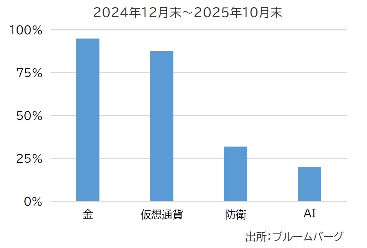 金:S&P Commodity Producers Gold Index、仮想通貨:Solactive Blockchain Index、防衛:Dow Jones U.S. Select Aerospace & Defense Index、AI:Global X Funds Global X Artificial Intelligence & Technology ETF(すべてトータルリターン、米ドルベース)