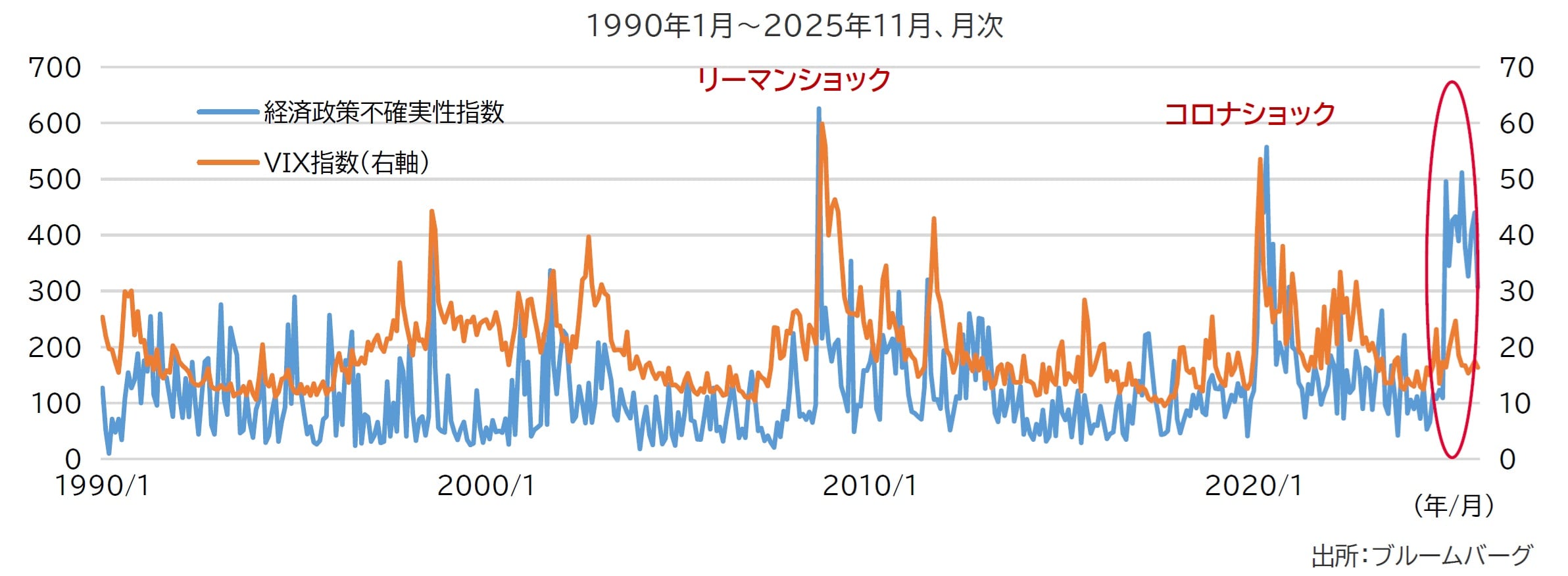 米国の経済政策不確実性指数は、足もとでリーマンショックやコロナショック時と同水準まで上昇していますが、VIX(恐怖)指数は落ち着いています(図表4)。