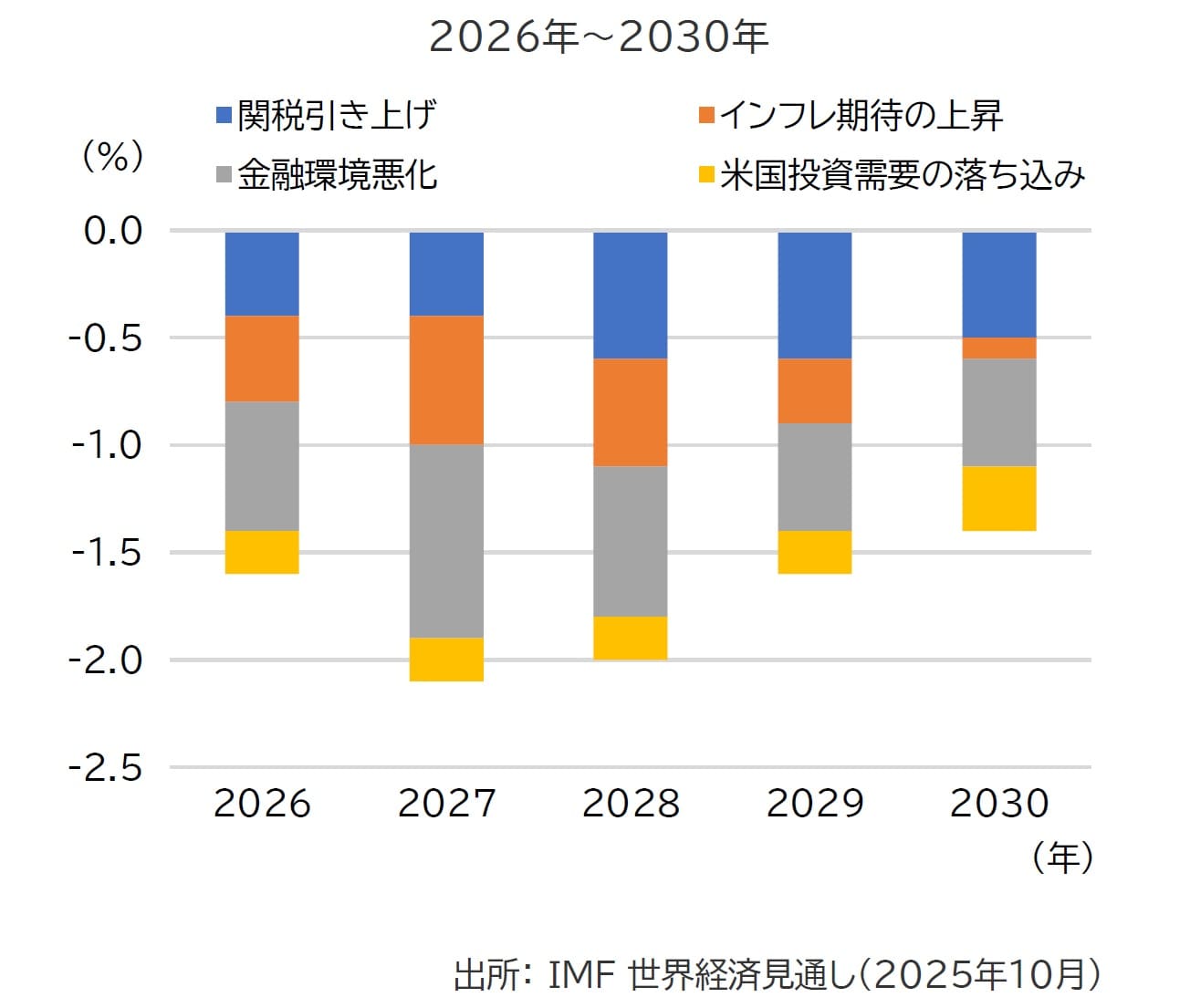 ネガティブシナリオとして、関税引き上げや財政赤字拡大による金利急騰など金融環境の悪化が想定されており、GDPへの影響は▲1.5~2%程度と試算されています(図表12)。