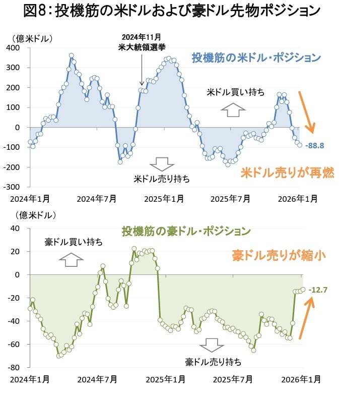 特に2025年末以降は、投機筋による米ドル売りが再び活発化したことを受け、豪ドルへの見直しが広がりつつあります(投機筋の豪ドル売りポジションは縮小、[図表8])。