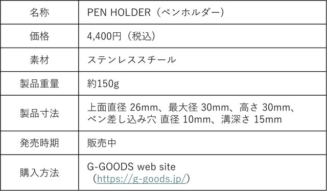 1951年創業、金属加工を専門とする株式会社後藤鉄工所(本社:新潟県三条市)のファクトリーブランド「G-GOODS(ジーグッズ)」は、愛用のペンを「デスクペン」へと変える新商品『PEN HOLDER(ペンホルダー)』の販売を開始した。