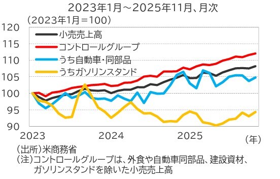 2025年11月の小売売上高は前月比+0.6%(10月:同▲0.1%)、変動の大きい業種を除いたコントロールグループは前月比+0.4%(10月:同+0.6%)と、ともに高い伸びを示し、個人消費の底堅さを裏付ける結果となりました(図表3)。