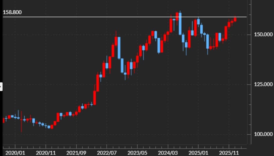 米ドル/円には、もう1つの重要な上値ポイントがあります。それが、2025年の高値である1ドル=158.8円です。先週はこれも早々に突破したことで、結果として、2024年7月に記録した「歴史的円安」のピークである161.9円が視界に入る展開となりました(図表2参照)。