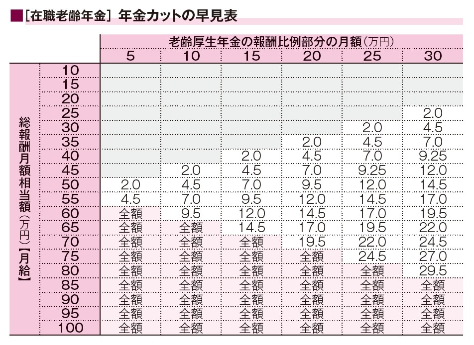 年金と給料の金額に応じて実際にいくら年金カットされるかは早見表をご覧ください。