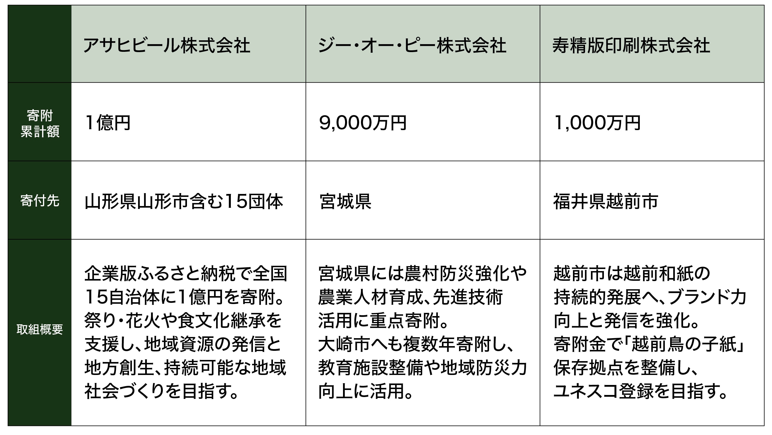 企業部門では、アサヒビール株式会社が「祭り・花火の支援」や「食文化の継承」をテーマに公募型支援を実施。自治体が主体的に事業構想を描く仕組みを通じ、地域の独自性を生かしたプロジェクトを後押ししてきた。