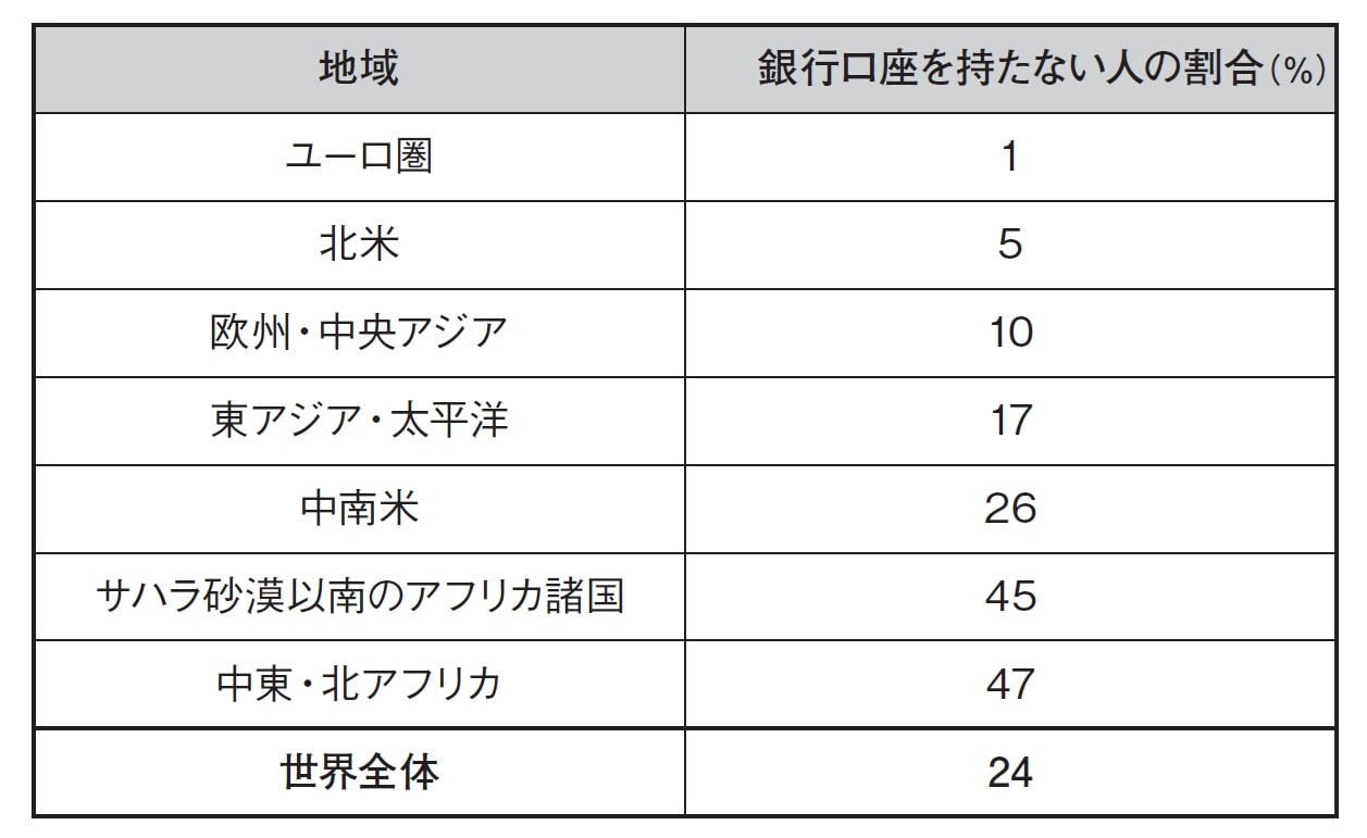 世界銀行では、金融サービスが利用できる人口の割合を国ごとに調査している。なお、世界銀行の定義に基づく「銀行口座の所有者」は、米国での定義よりも広い。携帯電話で送金・着金ができる人も銀行口座所有として扱われるからだ※。
