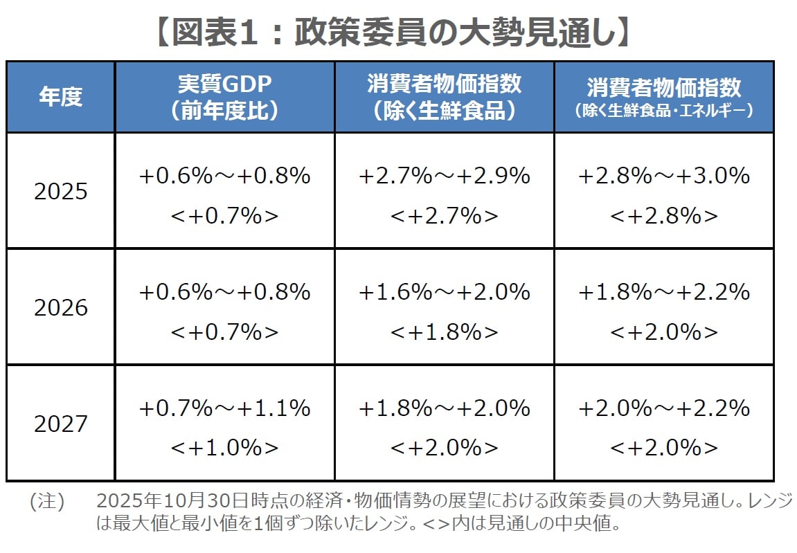 まず、展望レポートについて、実質GDP成長率は、2025年度が昨年12月の基準改定の影響で、2026年度は総合経済対策を受け、それぞれ前回(図表1)から上方修正が見込まれます。また、物価高対策で2026年度の物価見通しは下方修正が予想されます。リスクバランスの評価は前回、経済の見通しが「2026年度は下振れリスクの方が大きい」、物価は「概ね上下にバランスしている」でしたが、これらに変化があるか否かも注目されます。