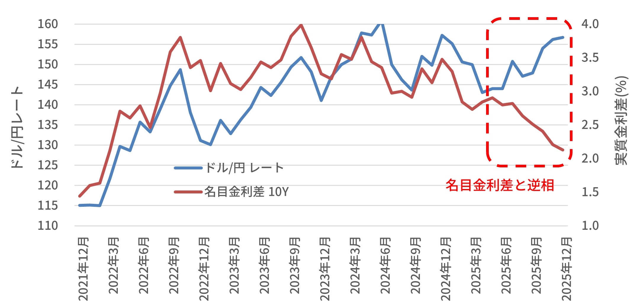 日本国債の利回り上昇が続けば、為替相場への影響を介して、相場に大きな転換点を生じ得る。たとえば、ドル/円レートは日米の名目金利差が縮小しているにも関わらず、2025年4月以降の相場では、逆相関となる円安傾向を示していた。