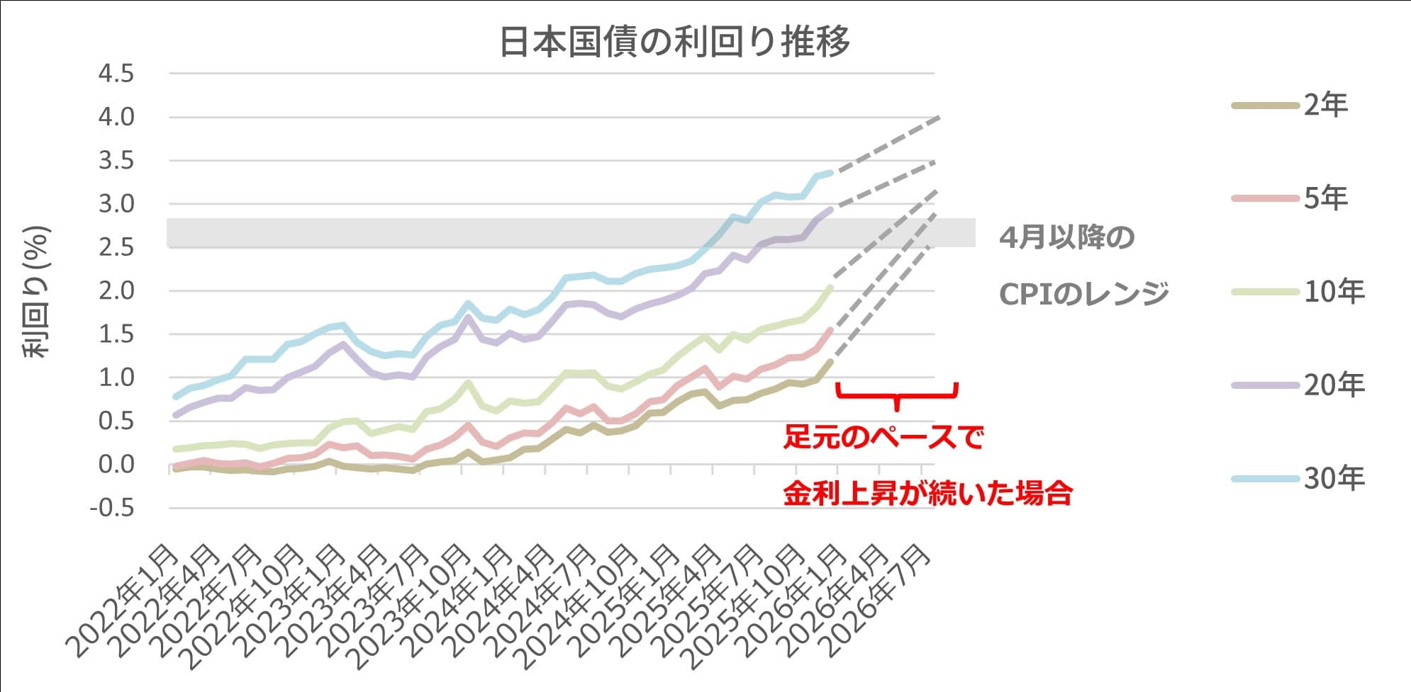 そこで、足元で生じている金利上昇にCPIのレンジを重ねてみる。足元では、衆議院選挙前の不透明感もあり、日本国債の利回りは急上昇を続けている。しかし、もし仮に現在のペースでの利回り上昇が継続した場合、10年国債は本年度中 (3月末まで) にも物価上昇率を超えやすく、さらに5年債の利回りも物価上昇率レンジの下限に到達する可能性がある。
