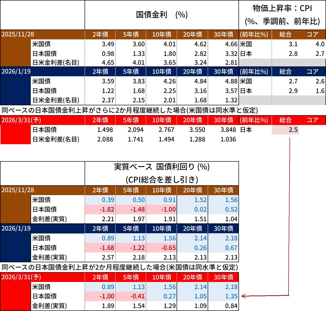 もし仮に11月末から足元(1/19)までの国債金利上昇ペースが、2026年3月末まで継続したら、相場はどのように見えるのだろうか。この想定の下での、各年限の利回り水準から、CPI総合を差し引いた水準を「実質利回り」とみなした場合の水準を下表に示した。