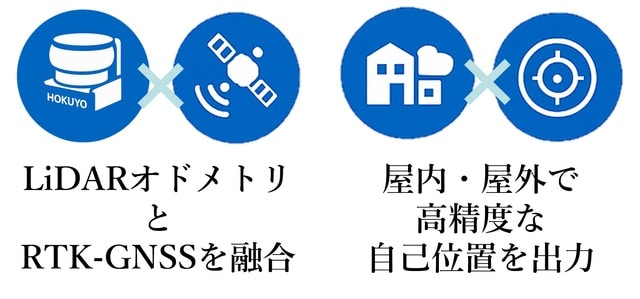 本製品は屋外を自律移動するロボットに自己位置推定データを提供します。3D-LiDAR・IMU・GNSSの統合により、屋内外をシームレスに移動するロボットを実現することが可能です。また、本製品で動作するROS2の自律走行パッケージをオープンソースとして公開します。