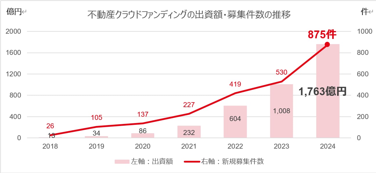 不動産クラウドファンディングをはじめとする不動産小口化商品の市場は、近年、急速な拡大を遂げている。国土交通省が発表したデータによると、2024年不動産クラウドファンディングの新規出資額の推移は1,763億円に達しており、個人投資家の参入も相まって市場の裾野は着実に広がっている。