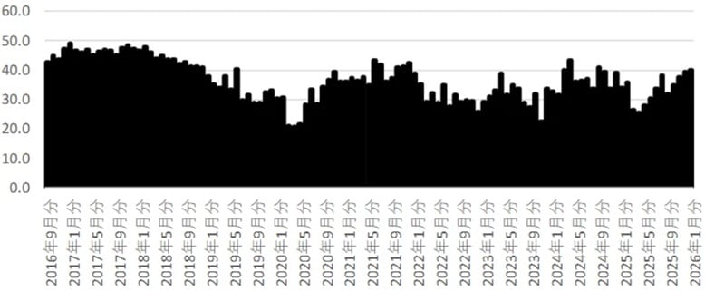 25年3月以降は80台で推移。26年1月は85.2と25年2月の90.2から振幅を伴いつつ緩やかですが、下降傾向にあります。25年12月の86.0からは0.8ポイント低下しました。