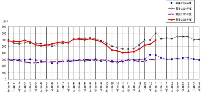 1月上旬の野菜・果実卸値は前年比で下落率が拡大。野菜は▲21.6%に