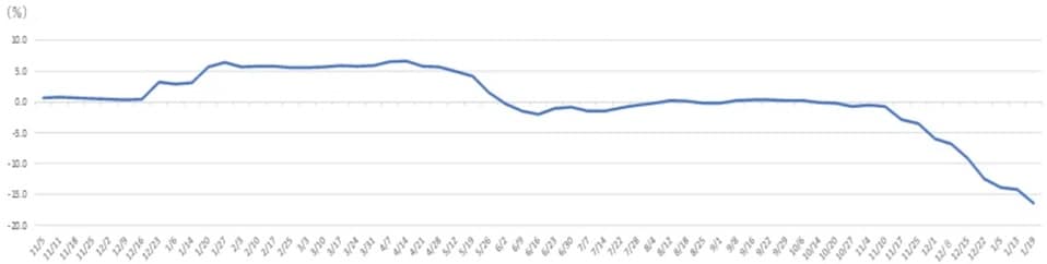 1月上旬の主要青果物卸売市場の卸値の平均価格の前年比は、野菜が▲21.6%、果実が▲16.0%になりました。12月中旬では、野菜が▲10.2%、果実が▲13.0%だったので、比較すると下落率が拡大しました。
