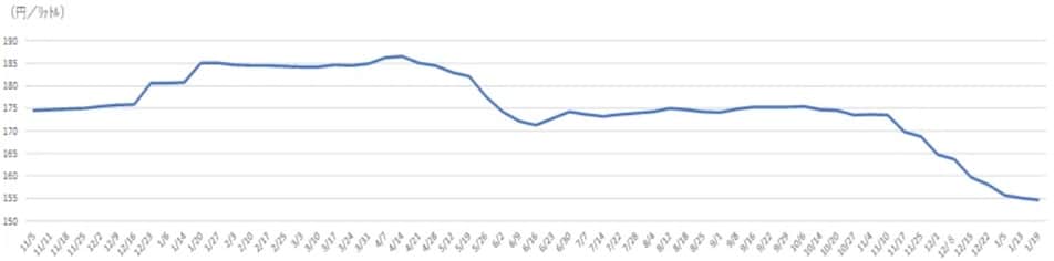 1月19日時点のレギュラーガソリンの全国平均価格は、154.7円/lで11月4日時点の173.6円/lから10回連続で低下しています。1月19日時点のレギュラーガソリンの全国平均価格の前年比は▲16.4%の減少率で、マイナスは14回連続です。