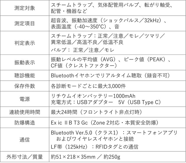 スチームトラップ・バルブ診断器、振動計、温度計、聴診器の機能を1台に集約。