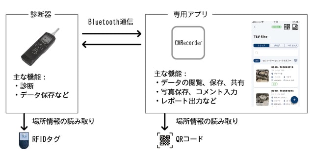 測定結果はBluetooth通信によりスマートフォンへ転送され専用アプリ(無料)と連携することで、点検対象の特定から、測定、記録、管理までを一連の流れで素早く実施できます。