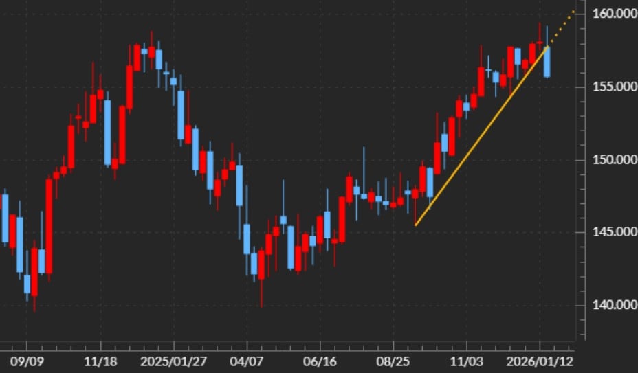 先週は、日銀イベントを手掛かりに円売りが進み、一時159円台となったものの、すでに見てきたように日米協調による円安阻止介入への警戒などを主な理由として、その後は円高に急反転するところとなりました。これにより、2025年10月の高市政権誕生を前後して広がった米ドル高・円安のトレンドを割れたようにも見えることから、テクニカルには米ドル高・円安一服の可能性も出てきました[図表3]。