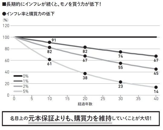 [図表1]は、横軸に経過年数、縦軸に購買力をとり、インフレによって購買力がどの程度下がっていくかを表したものです。