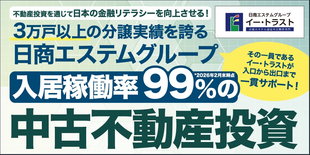 イー・トラストは、創業35年目の実績を持つ「日商エステム」のグループ会社です。中古マンション経営、投資・収益物件の案内・投資のコンサルティングのほか、不動産売却の査定・買取り、不動産クラウドファンディング等、不動産取引に関して幅広いサービスを提供しています。