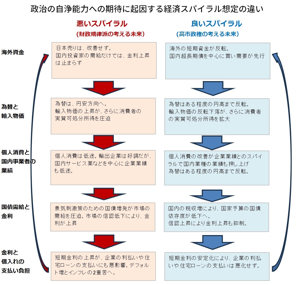 こうした考え方の違いは、もはや主義主張に属するものであって、この前提が異なると、今後の未来に生じ得る「経済スパイラル」も、まったく正負の方向性が真逆のものとなる(図表4)。