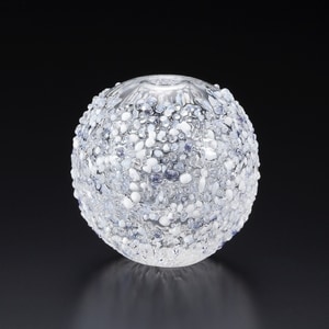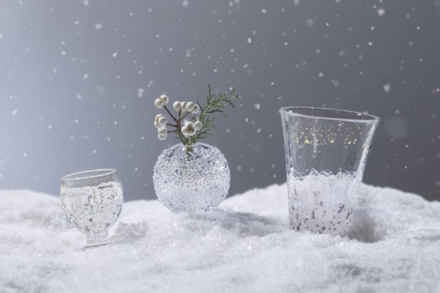 従来の津軽びいどろが持つ多彩な色づかいとは一線を画し、本シリーズでは白を基調とした透明感のある色合いを採用。控えめに配した金箔のあしらいや、絶妙な粒の残し方、淡く陰影の奥に宿る紫のニュアンスなど、職人の高度な技術によって、雪が重なり合うことで生まれる奥行きと静かな陰影を表現しています。積もった雪がつくる澄んだ空気感や、冬の静寂をやさしく感じさせる想いが込められたシリーズです。現在、次なる展開も構想されています。