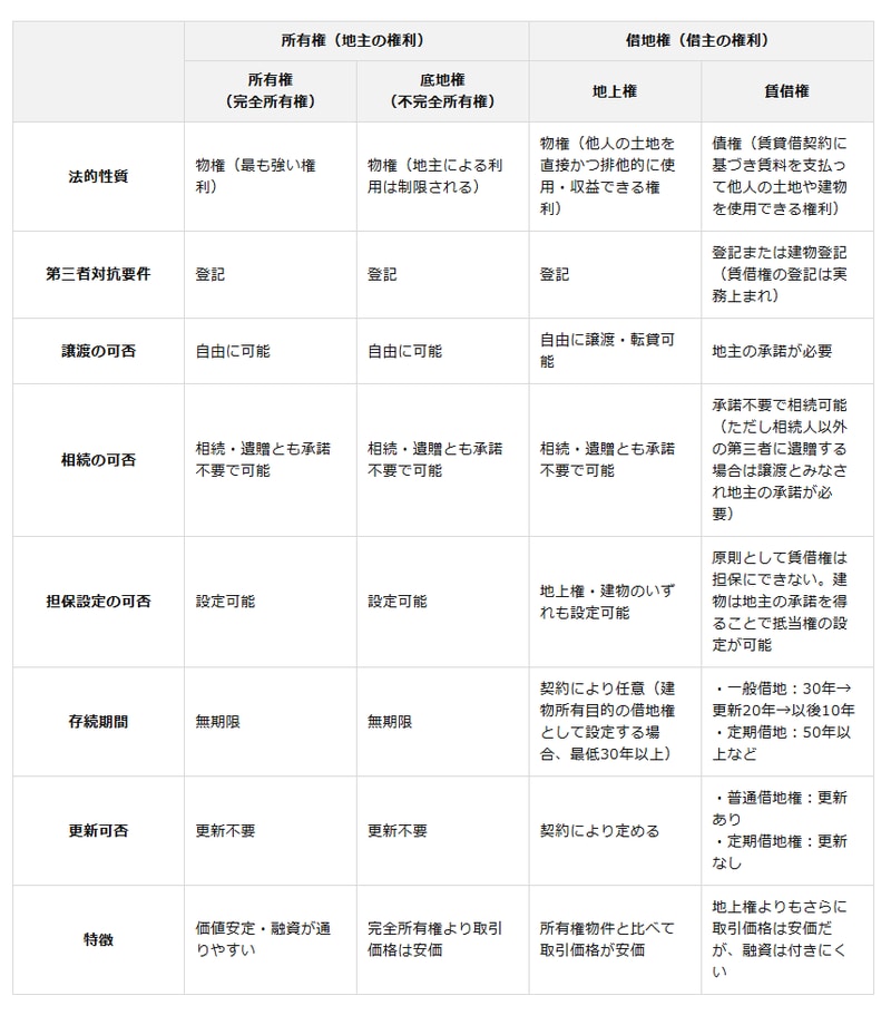 ここでは、所有権・借地権(賃借権・地上権)・底地権の関係を整理します。法的性質や第三者対抗要件、譲渡・相続・担保設定の可否、存続期間・更新の考え方などを比較しましょう。