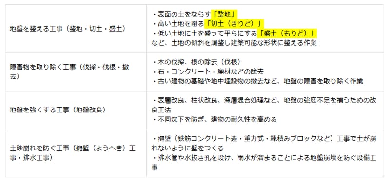 造成工事にはさまざまな種類があり、土地の状態や目的に応じて複数の工法が組み合わされます。主な工事内容は以下の通りです。