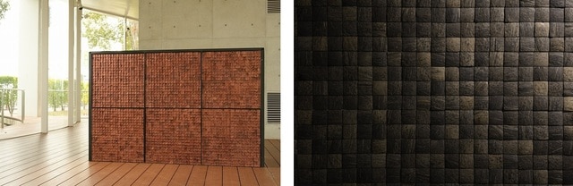 素材・環境配慮:廃棄されるココナッツ殻をチップ化。内装材として再利用したアップサイクル素材。天然素材ならではの色幅・質感・表情を活かした意匠。