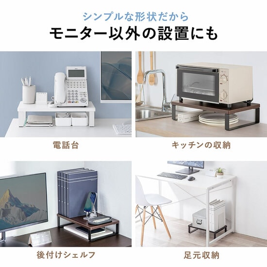 本製品はモニター台としてだけでなく、プリンター台・電話台・テレビ台としても活躍。さらにデスクサイドに置けば、デスクシェルフとしても使用可能です。1台で複数の役割をこなす、汎用性の高い机上台です。