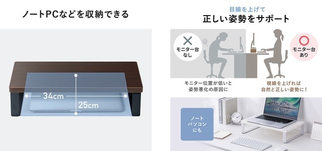 幅40cmのコンパクト設計により、ノートパソコン用デスクや省スペースなワークデスクにも無理なく設置可能。モニター下の空間を収納として活用できるため、デスク上が自然と整理され、作業スペースが広がります。