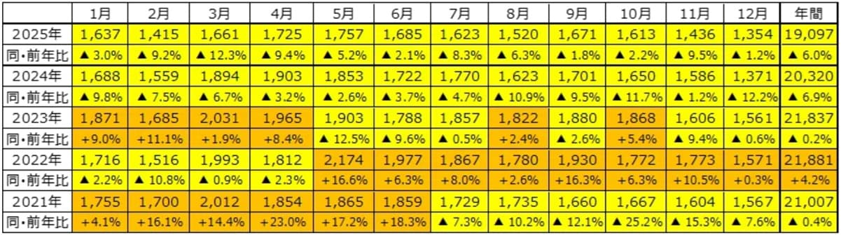 1月▲9.8%、2月▲7.6%、3月▲6.9%、4月▲3.2%、5月▲2.6%、6月▲4.0%、7月▲4.6%、8月▲11.1%、9月▲9.9%、10月▲12.2%、11月▲1.8%、12月▲12.9%