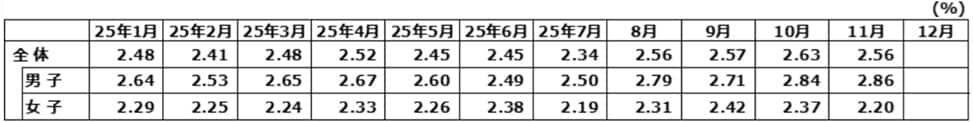 1月30日に発表される25年の失業率は2.5%になることが確実と予測します。季節調整値の完全失業率を小数点第2位までみると、24年1月から11月までの平均は2.50%です(25年1月分発表時に季節調整替えが行われます)。