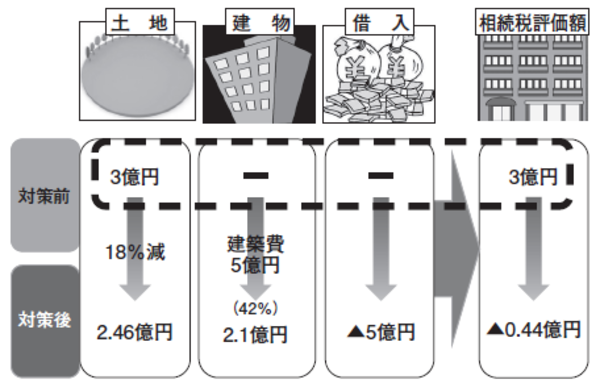 「3億円を現金で持っていると、3億円の評価のままですよね。しかし、土地の場合、そこに5億円の借り入れをし、賃貸マンションを建てると、土地の評価は貸家建付地として約20%減り、約2億4000万円になります。建物も、固定資産税評価と貸家権控除などにより、約2億1000万円ほどになります。しかもマンション購入の際の借入額を債務控除できますので、評価額はマイナスとなり、相続税0円が実現できるわけです」