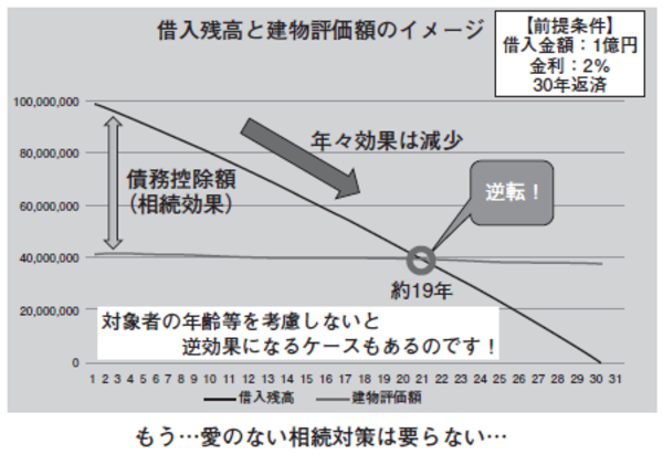つまり、節税効果だけを見れば、建築した当初が一番効果があるわけです。言い方は悪いですが、アパートが完成した瞬間に亡くなってもらうのがベストという意味で、「早く死んでください」と言っているようなものなのです。