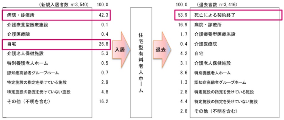 また同調査では、ホームの入退去状況も確認できました。まず入居は、病院・診療所からが42.3%、自宅からが26.8%と続きます。一方退去の理由は、死亡による契約終了が53.9%、疾病や介護、認知症などでの転居が一定数あります。