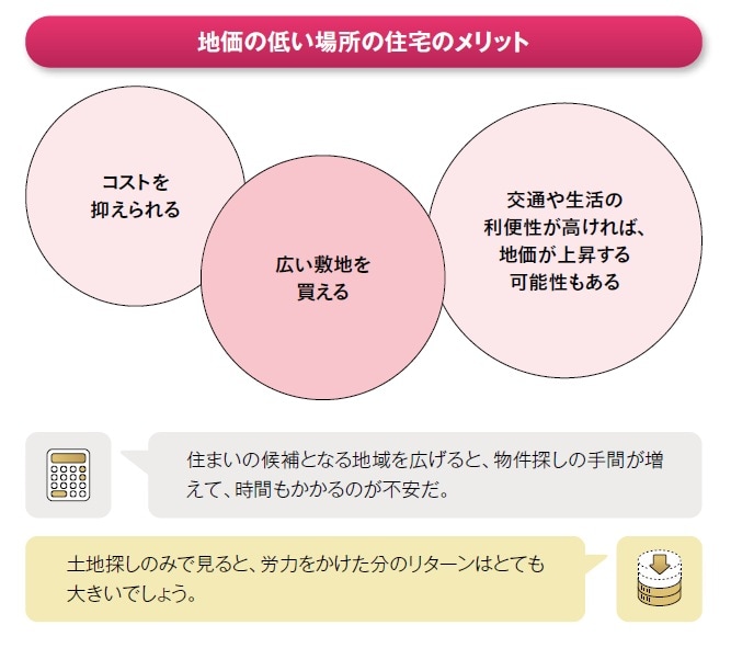 住まいの候補となる地域を広げると、物件探しの手間が増えて、時間もかかるのが不安。土地探しのみで見ると、労力をかけた分のリターンはとても大きいでしょう。