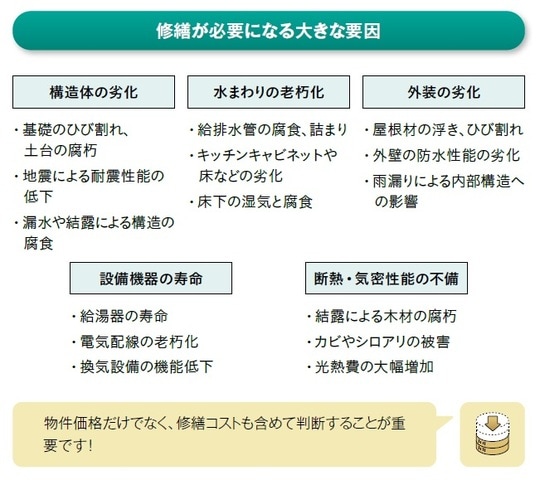 とりわけ中古物件は劣化しています。例えば基礎にひび割れなどがあった場合、構造補強工事が必要で、200万円近くを要することもあります。シロアリが発生している場合、床下部分の改修も必要になり、その工事費は100万円以上も。中古物件の場合、修繕コストを準備しておく必要があるわけです。なお、中古マンションの多くは、修繕積立金が新築よりも高く設定されています。