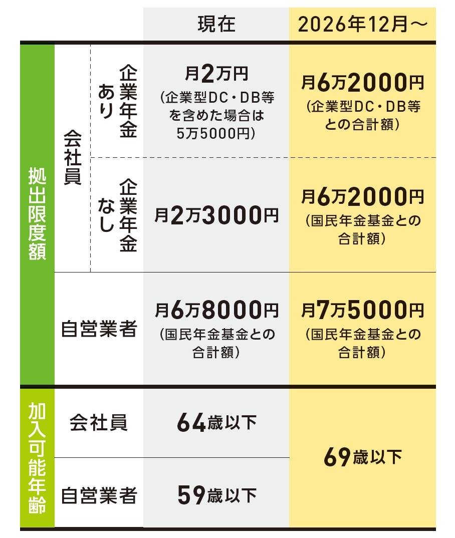 また、加入可能年齢の引き上げについては、改正によって新たに加入できる人の範囲が広がりました。具体的には、60歳以降で現在のiDeCoに加入できない人も対象になります。拠出限度額は、月額6万2000円。