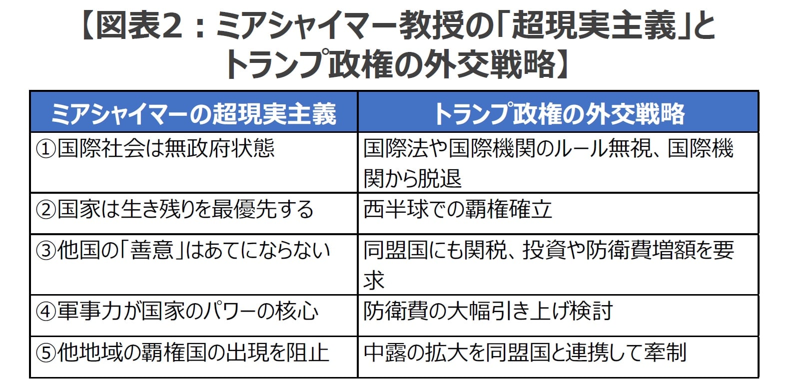 リアリズムに徹した論理展開とその過激な見解から地政学や安全保障政策の分野で物議をかもしてきたミアシャイマー教授の「超現実主義」のポイントについて、誤解を恐れず簡潔にまとめると、(1)国際社会は「無政府状態(アナーキー)」であり、(2)国家は「自身の生き残り」を最優先し、一方で、(3)他国の「善意」はあてにならず、(4)軍事力(特に陸軍力)が国家のパワーの核心をなし、生存のため「攻撃的なパワーの獲得を追求」し、さらに、(5)地域の覇権国は他地域における覇権国の出現を阻止しようとする、というものです。