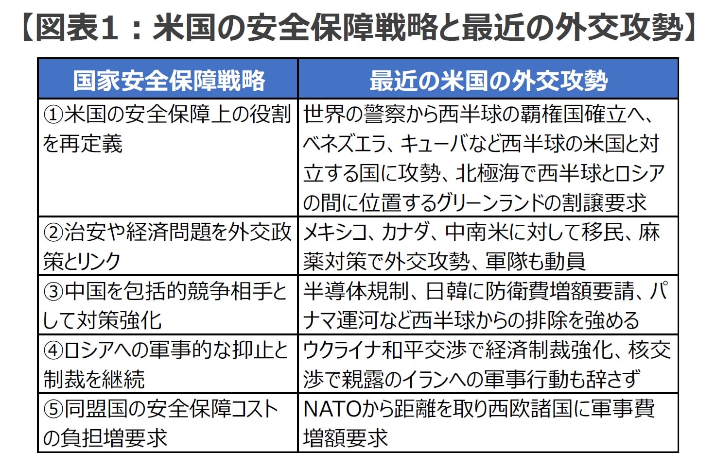 米国は昨年12月に国家安全保障戦略(NSS2025)を改定しましたが、そのポイントは、(1)国益を最優先して米国の安全保障上の役割を再定義し、(2)国内治安や経済問題を安全保障の課題として外交政策とリンクさせ、(3)中国を「最も包括的な競争相手」として経済・軍事・技術の全領域での競争を強化し、(4)ロシアへの軍事的な抑止と制裁を継続するとともに、(5)各地域の安全保障について同盟国の負担増と米国の負担軽減を求める、といった内容でした。