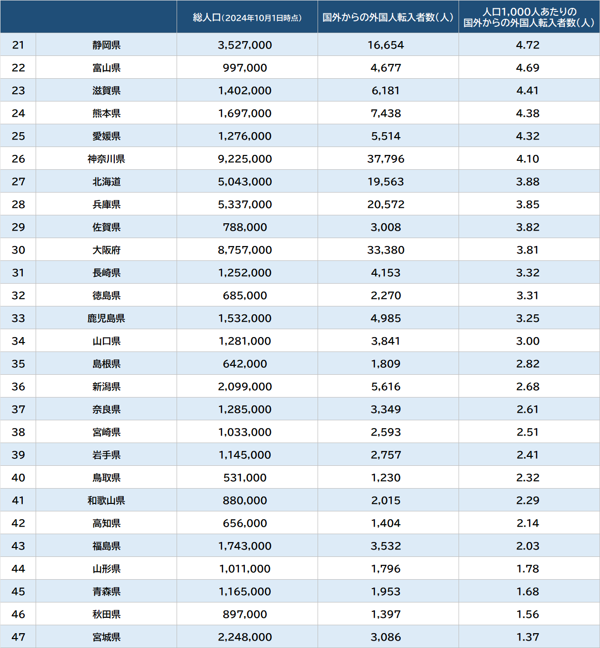エトセトラ 統計 シェア Tweet [連載] 統計から紐解く日本の実情…統計・調査・ランキング資料 【ランキング】47都道府県「外国人流入数」…〈住民基本台帳人口移動報告2025年結果〉 SGO編集部 2026.2.5 統計 調査 都道府県「国外からの外国人転入者数」21~47位 出所:総務省『住民基本台帳人口移動報告2025年結果』、総務省『2024年10月1日現在人口推計』