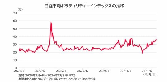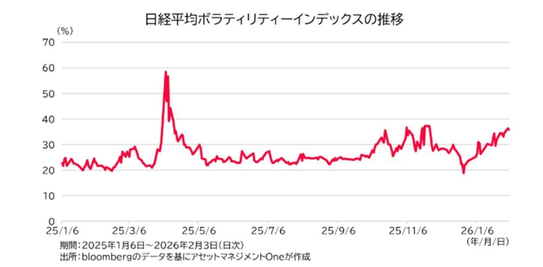 一方、株式市場では違った見方をされています。日経平均VIX(ボラティリティー指数)は、昨年のトランプ関税時ほどではありませんが、昨年秋の高市政権成立時の水準までジワリと上昇。足元で日本株の主要指数は過去最高値を更新しましたが、急ピッチで株価が上昇したこともあり、調整懸念が根強いとみられます。また、為替市場の動向が不安定であることや、解散総選挙および財政への期待が先行した株価上昇であったこともボラティリティーが高止まっている一因と考えられます。