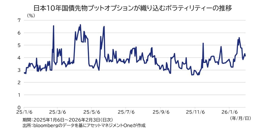 2月初旬時点で市場ではどう見られているのかを確認します。まず日本の債券市場は、足元で意外にも落ち着いています。解散報道直後に減税の議論が活発化した際には財政懸念から長期金利が乱高下しましたが、足元では日本の10年国債利回りは2.25%前後で推移しています。目先1か月のオプション価格が織り込むボラティリティーも落ち着いており、オプション市場は選挙に向けて大きな金利変動を見込んでいる訳ではないようです。