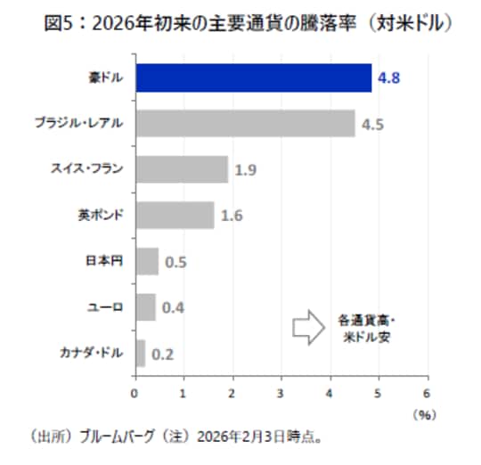 特に2026年初以降は、トランプ政権の政策不透明感から米ドル安観測が再燃していることも、米ドルからの通貨分散先として豪ドルが見直される一因となっていると考えられます(図4)。実際、2026年初来の対米ドルでの通貨騰落率を比較すると、豪ドルは+4.8%と主要通貨の中でも堅調なパフォーマンスを示しています(図5)。