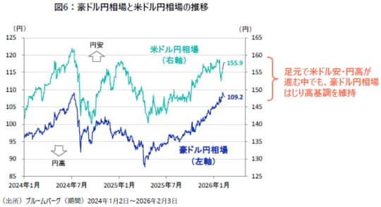 また、2026年1月の為替市場では、日米当局によるレートチェック観測が浮上し、米ドル円相場は一時1米ドル=152円台まで円高・米ドル安が進行しました。一方、豪ドル円相場は、米ドルに対する豪ドルの底堅い推移を背景に、緩やかな円安・豪ドル高の基調を維持しました(図6)。こうした足元での豪ドル円相場の安定は、豪ドルへの通貨分散の有効性を示唆していると考えられます。